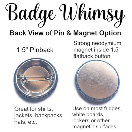 The style options for my 1.5 inch buttons are a pin, a magnet or a retractable badge reel (black slide clip or alligator swivel clip). Please note the PIN and MAGNET option are NOT retractable badge reels. See pictures for examples of each style. The button is covered in plastic mylar (simply wipes clean).
