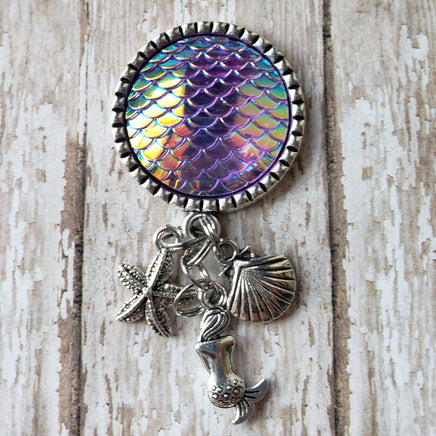 This retractable badge holder with your choice of slide clip or alligator swivel clip would be a great gift or treat yourself! The mermaid scales are a carved resin cabochon placed on an antique silver colored pendant tray. While this one has a purple hue, they still tend to pick up colors from objects around them. See images for examples of this. Please note that it is not waterproof so do not submerge in water.