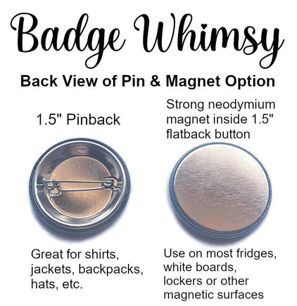 The style options for my 1.5 inch buttons are a pin, a magnet or a retractable badge reel (black slide clip or alligator swivel clip). Please note the PIN and MAGNET option are NOT retractable badge reels. See pictures for examples of each style. The button is covered in plastic Mylar (simply wipes clean).